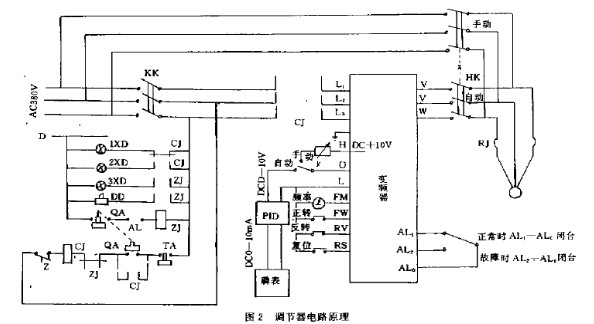 2)技術(shù)參數(shù)為:適配電機(jī):M4kw交流電機(jī);輸入電源三相380~415V士10%、50HZ;輸出電壓:三相380~460V、0.5~360HZ;輸出電流:8.6A;重量:0.ekg。1.ZXi作原理本裝置以磷酸根分析儀作為檢測儀表。當(dāng)爐水中磷酸根含量發(fā)生變化時,磷酸根分析儀送出與磷酸根濃度相對應(yīng)的0~10mA電流信號.輸入調(diào)節(jié)器巾.與調(diào)節(jié)器巾頂牛設(shè)家的磷酸圖1加藥控制框圖根濃度進(jìn)行比較,將控制信號輸出至變頻器,后者按控制信號的大小將三相380V、50Hz交流電源變?yōu)橄鄳?yīng)頻率及電壓的三相電源,送至交流電機(jī),以改變電動機(jī)轉(zhuǎn)速,從而改變往復(fù)泵的往復(fù)頻率,使?fàn)t水的磷酸根濃度保持在設(shè)定范圍內(nèi)。自動磷酸鹽加藥裝置采用兩臺控制儀及三臺加藥泵。1號、3號磷酸鹽泵常開,2號泵備用。當(dāng)1、3號泵出現(xiàn)故障時,可通過控制柜上的轉(zhuǎn)換開關(guān)啟動備用泵向爐內(nèi)加藥,同時設(shè)有自動/手動切換開關(guān),當(dāng)自動調(diào)節(jié)系統(tǒng)出現(xiàn)故障時,可切換至手動。電路原理如圖2所示(以2號爐為例)。2系統(tǒng)調(diào)校2·1參數(shù)設(shè)定參數(shù)設(shè)定對自動調(diào)節(jié)系統(tǒng)投入運(yùn)行十分重要。設(shè)定恰當(dāng)與否將直接影響自動調(diào)節(jié)的效果,但由于影響磷酸根濃度的因素較多,難以準(zhǔn)確測試,因而采用經(jīng)驗(yàn)法對系統(tǒng)參數(shù)進(jìn)行設(shè)定。1)磷酸鹽泵行程未裝自動調(diào)節(jié)時,磷酸鹽泵行程一般調(diào)節(jié)在30%~50%之間即可達(dá)到機(jī)組對磷酸根濃度的要求,因此。担埃バ谐獭#玻┱{(diào)節(jié)器參數(shù)由于磷酸根濃度是一多容且滯后大的對象,初始PID設(shè)定為:6取80呢、T;。担恚椋、Tn取lmin、采樣周期4min。3)變頻器參數(shù)最低頻率:10HZ;最高頻率:50HZ。