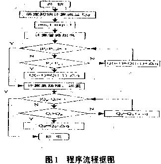 2數(shù)值計(jì)算方法對于(7)式,i=n—1時(shí),只有Qn-t.Qn兩個(gè)未知量,對Q”賦初值,通過迭代解(7)式可求得Qi,如此從后至前,依次遞推,可求得各分支管路的流量、泵流量及沿程總摩阻,將求得的結(jié)果代入(4)式校核,若沿程摩阻大于泵揚(yáng)程,則減小Q的值,反之,則增大Qn,如此反復(fù),直至沿程總摩阻與泵揚(yáng)程的差值在給定精度范圍內(nèi),退出循環(huán)。按以上計(jì)算思路編程,主要計(jì)算程序框圖如圖1所示。