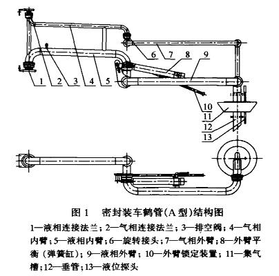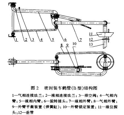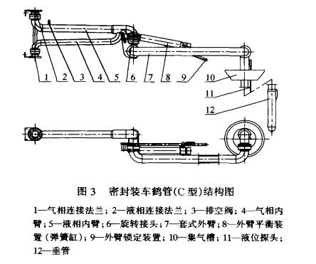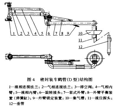 鶴管的區(qū)別是:C型的氣相管連接法蘭向下,液相管連接法蘭向上,D型與C型相反。不難看出,A型和B型與C型和D型密閉裝車鶴管相比較,后者具有明顯的優(yōu)越性。