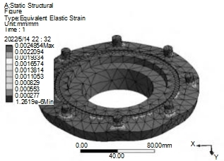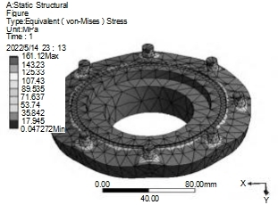 為了便于分析,設(shè)計采用了Solidworks中Work-bench模塊。接頭中金屬材料選用不銹鋼材料,網(wǎng)格劃分的大小設(shè)置為3mm長度,其中外法蘭盤劃分效果如圖4所示。