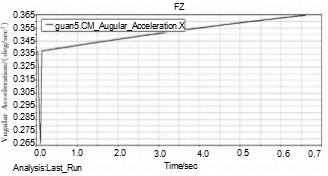 為了確保所設(shè)計自主補油裝卸鶴管的安全、有效,設(shè)計中基于adams軟件進行了運動仿真,并對裝卸鶴管末端關(guān)節(jié)的位移、速度和角加速度進行分析。圖9給出了相應(yīng)的位移、速度和角速度曲線。由位移圖可以看出,前2s之內(nèi)線性位移值為X軸從-2800~-2200,總位移量為600mm,呈對稱變化,后2s內(nèi)平穩(wěn)運動;由速度圖可以看出,末端關(guān)節(jié)大線性速度為每秒500mm,在經(jīng)過約2s后趨于穩(wěn)定,前2s內(nèi)速度在正負值每秒500mm區(qū)間波動,后2s停止運動,速度趨近于0;由角速度圖可以看出,角加速度一開始劇烈的下降到0.264°/(m2·s),0.1s之后緩速直線上升,趨于穩(wěn)定。