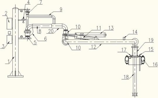 旋轉(zhuǎn)接頭,11-液相管。12-外臂,13-平衡器,14-排空閥,15-高液位探頭,16-密閉蓋,17-氣囊進氣管,18-伸縮垂管,19-雙層管,20-伸縮管。