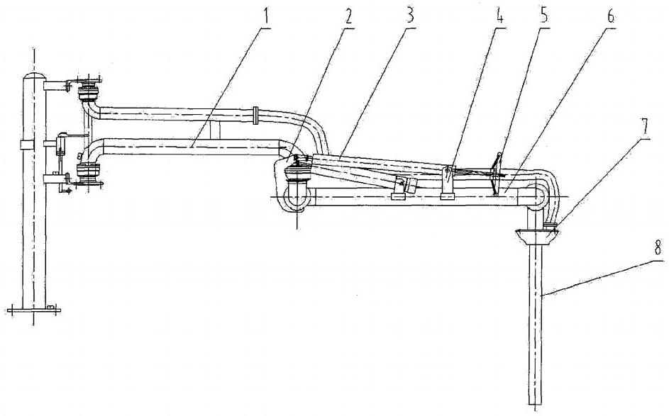 圖1是本發(fā)明的結(jié)構(gòu)示意圖,圖2為圖一的俯視圖。圖中:1——鶴管內(nèi)臂,2——鶴管內(nèi)、外臂連接彎頭靠外臂端固定支架,3——旋轉(zhuǎn)壓緊彈簧缸,4——固定支架,5——彈簧缸旋轉(zhuǎn)壓緊輪,6——鶴管外臂,7——鶴管密封帽,8——鶴管垂管。