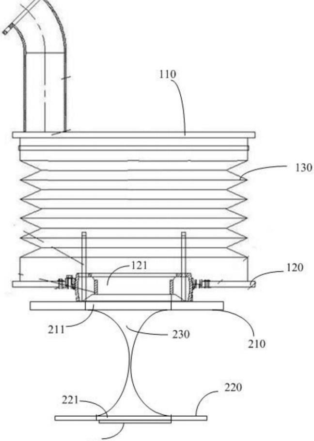 上連接板,具有管道上通孔:下連接板,具有管道下通孔;平衡器,設(shè)置在上連接板和下連接板之間;上接口板,具有上接口,上接口連通管道下通孔;下接口板,具有下接口,下接口板通過支撐臂連接上接口板;橡膠封閉通路,上端連通上接口,下端連通下接口;橡膠封閉通路的中部由橡膠管壁彈性擠壓封閉。