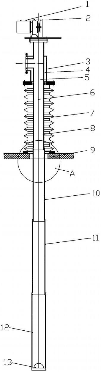 一種氣動(dòng)裝車鶴管的密閉伸縮垂管系統(tǒng),包括伸縮垂直管、控制伸縮垂直管垂直運(yùn)動(dòng)的氣動(dòng)馬達(dá)升降系統(tǒng)和安裝在伸縮垂直管上的密閉蓋,伸縮垂直管中部空心設(shè)有進(jìn)液口和出液口,伸縮垂直管的外側(cè)套裝有密閉的可伸縮油氣回收管,可伸縮油氣回收管的一端與密閉蓋密封連接并且密閉蓋上設(shè)有油氣回收口與可伸縮油氣回收管內(nèi)部連通,可伸縮油氣回收管另一端與鶴管的氣相管連接。