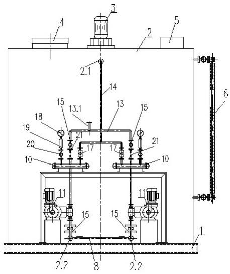 實施例1:磷酸鹽加藥裝置,包括底部基座1、設(shè)置于基座1上的加藥溶解箱2,加藥溶解箱2頂端設(shè)置有攪拌裝置3,攪拌裝置3攪拌軸伸入加藥溶解箱1內(nèi),攪拌裝置3一側(cè)設(shè)置有活動可拆卸式溶解筐4以及自來水進(jìn)管5,加藥溶解箱2側(cè)壁設(shè)置有側(cè)裝式磁翻板液位計6,加藥溶解箱2底端設(shè)置有排污管7,加藥溶解箱2近頂端設(shè)置有溢流出液口2.1,加藥溶解箱2近底端設(shè)置有兩個出液口2.2,兩個出液口2.2設(shè)置連通管道8相互并聯(lián),并各自設(shè)置一出液管道9分別連接一分配母管10,出液管道9上均各自設(shè)置有一計量泵11,分配母管10間設(shè)置有并聯(lián)管道13并聯(lián),并聯(lián)管道13上設(shè)置藥液出口13.1,溢流出液口2.1設(shè)置溢流管道14分別連接兩個分配母管10。出液口2.2與計量泵11之間的出液管道9上設(shè)置有出液球閥15。溢流出液口2.1與分配母管10之間的溢流管道14上依次設(shè)置有Y型過濾器16、出液球閥15以及出液安全閥17。分配母管10上均設(shè)置有壓力表18,壓力表18與分配母管10的連接管道上設(shè)置有壓力表用球閥19、壓力表用緩沖罐20。并聯(lián)管道13上出液球閥15和出液止回閥21。