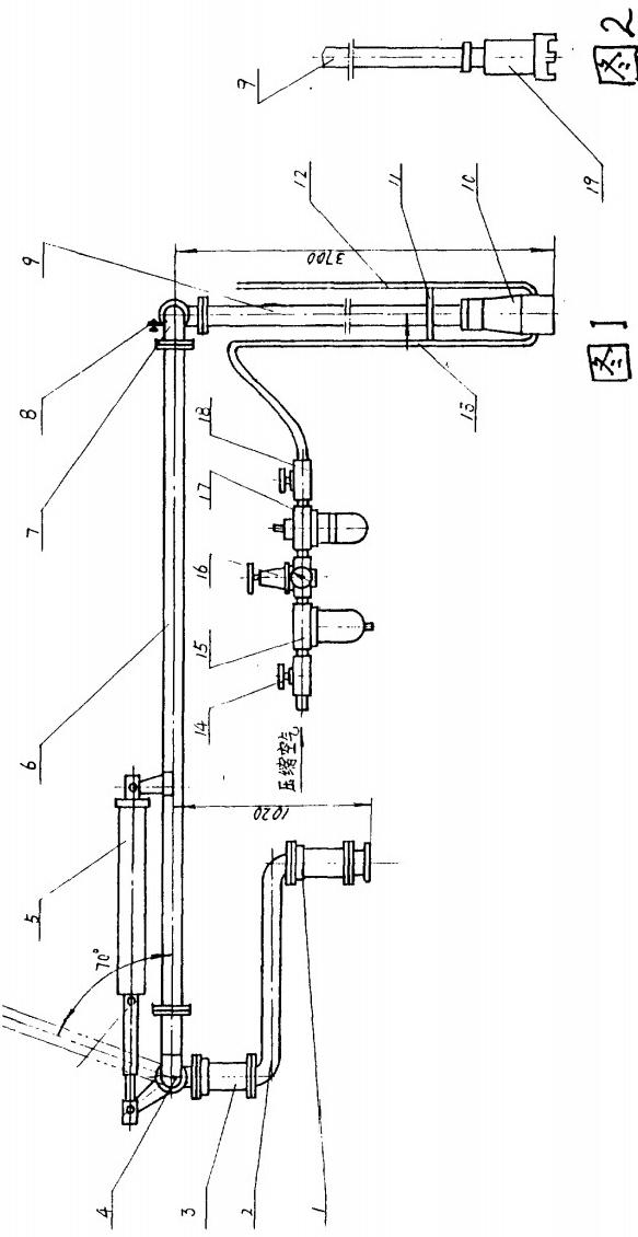 圖1中由下旋轉(zhuǎn)器(1),水平短管(2)和上旋轉(zhuǎn)器(3)連成的整體件通過升降器(4)與水平長(zhǎng)管(6)連接,平衡器(5)與升降器(4)連接,裝置在水平長(zhǎng)管(6)上,由潛油泵(10)與垂直管(9)連成的整體件連接水平長(zhǎng)管(6)的另一端,進(jìn)氣管(13)的一端連接球閥(14)、分水濾氣器(15)、調(diào)壓閥(16)、油霧器(17)和球閥(18),進(jìn)氣管(13)的另一端穿過潛油泵(10)而置,并伸出一部分管件作為排氣管(12),另外,也可用潛油泵替代管(19)代替潛油泵(10)使用,其性能和效果與本實(shí)用新型提出的鶴管一樣,所述垂直管(9)的下端與潛油泵(10)的上端均分別設(shè)有一快速接頭,便于聯(lián)接垂直管(9)。潛油泵(10)工作時(shí)壓縮空氣通過球閥(14)、分水濾氣器(15)、調(diào)壓閥(16)、油霧器(17)和球閥(18)由進(jìn)氣管(13)進(jìn)入氣動(dòng)馬達(dá),氣動(dòng)馬達(dá)帶動(dòng)潛油泵(10)將油泵入與之相連的鶴管,然后啟動(dòng)泵房油泵,卸油即順利進(jìn)行,而無需倒灌排氣式真空泵配合,啟動(dòng)非常方便。同時(shí),通過潛油泵(10)泵入鶴管的油,油壓增加了一個(gè)設(shè)定值,因此不管在鶴管的任何位置,管內(nèi)的油壓總是大于汽油的飽和蒸汽壓,使汽化不能進(jìn)行,從而從根本上排除了產(chǎn)生“氣阻”的可能性,保證卸油工作的正常進(jìn)行。