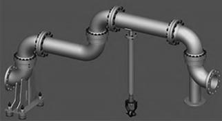經(jīng)過(guò)分析確定密閉裝車鶴管滴油的原因,制定下一步整改措施,替代金屬軟管結(jié)構(gòu)形式。通過(guò)橫向比較,同行業(yè)鐵路裝車大鶴管均為金屬軟管連接結(jié)構(gòu)形式,終在實(shí)際生產(chǎn)過(guò)程中受鐵路裝車懸臂式小鶴管結(jié)構(gòu)啟發(fā),鶴管為硬管連接結(jié)構(gòu)形式,通過(guò)兩個(gè)轉(zhuǎn)動(dòng)結(jié)完成垂直管與槽車口的水平對(duì)位,猜想可否通過(guò)轉(zhuǎn)動(dòng)結(jié)實(shí)現(xiàn)大鶴管垂直管的水平對(duì)位。通過(guò)建立模型,在桌面上驗(yàn)證是否可以實(shí)現(xiàn)鶴管固定軌道上的水平位移對(duì)位(圖3)。經(jīng)過(guò)多次實(shí)驗(yàn)和測(cè)繪對(duì)比,確定改造后的連接結(jié)構(gòu)形式為“轉(zhuǎn)動(dòng)結(jié)三聯(lián)組件”,由3個(gè)90。轉(zhuǎn)動(dòng)結(jié)與直管段組成硬管延伸結(jié)構(gòu),代替現(xiàn)有的金屬軟管(圖4)。