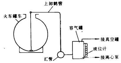 由于通往泵房的管道直接插入匯管上,匯管內只要有氣體存在,必然在此處造成氣(或汽)液混合物,液體中含氣量的增加對泵的工況不利。不僅降低效率,且對葉片(離心泵)造成氣蝕,嚴重時損壞葉片,使泵無法工作。若在泵入口管道的前部加一容氣罐(見圖6),并在其上加設液位計及上端加設可以抽吸氣體的支管到真空泵入口,則工況會大為改善。這樣離心泵不會再吸入氣液混合物,同時提高了匯管的真空度。只要容氣罐容量及安裝方位適度,就會確保任何液體介質的順利上卸,保證泵的高效及較高的使用壽命。