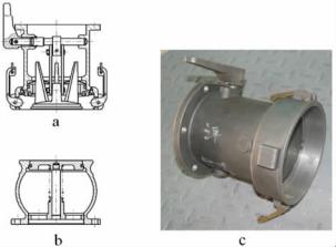 上裝快速分離閥是借鑒下裝鶴管的干式閥工作原理進(jìn)行設(shè)計(jì)制造的。由于快速分離閥位于液面以上,上裝發(fā)油的壓力小于下裝發(fā)油,考慮到制造方便,將干式閥碰鉤連接鎖緊機(jī)構(gòu)修改采用快速接頭的偏心凸輪夾緊機(jī)構(gòu),以適應(yīng)生產(chǎn)工藝的變化。